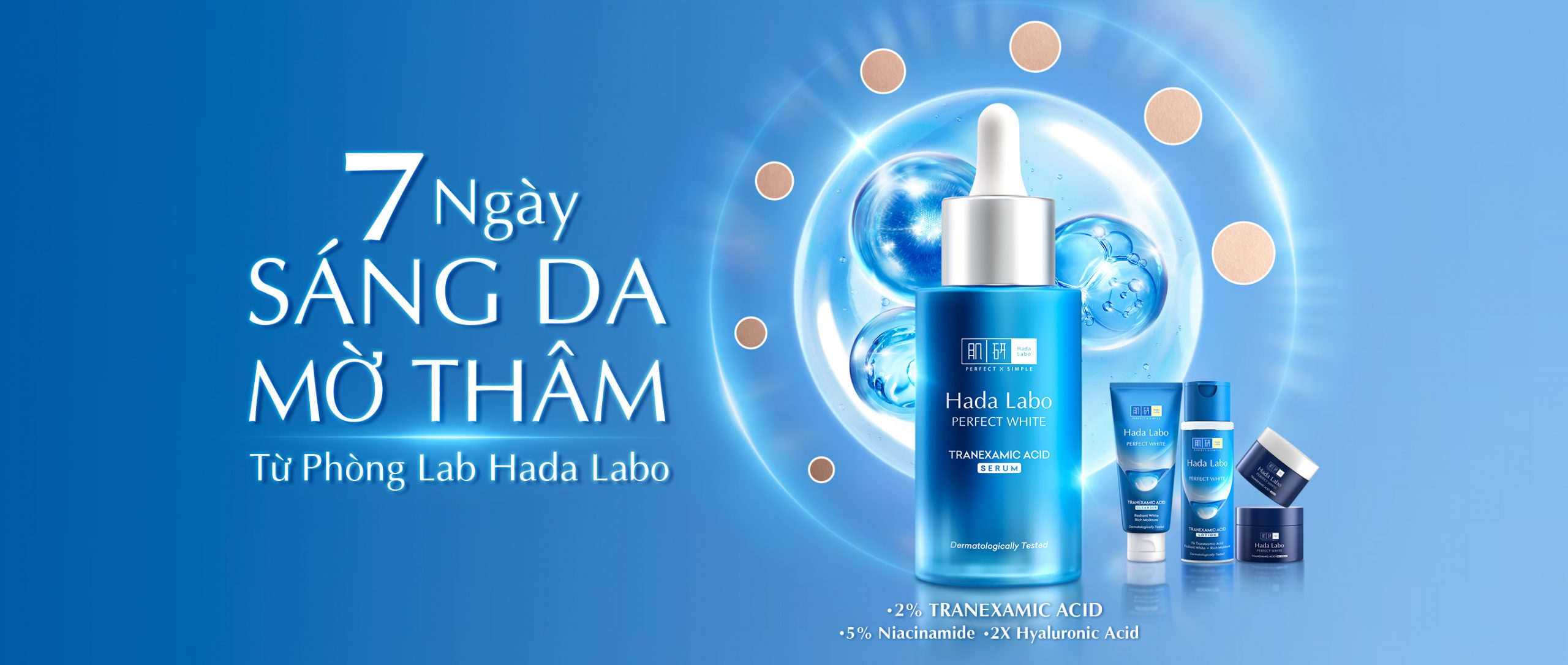 Dưỡng sáng, làm mờ thâm sạm và đều màu da với hệ dưỡng trắng Tranexamic Acid kết hợp Niacinamide, cùng Vitamin C & E.